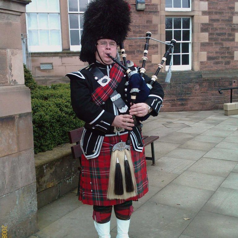 Most of my kilts are of the 'Scott' clan but I own a few others. I have what we call No.1. Dress uniform in two tartans. The Modern Red Scott and the Isle of Skye. This comprises on kilt, tunic, full plaid, feather bonnet (or Glengarry with feather), hose and white spats. The more normal competing uniform of a piper is now called No.2. Dress or Day Dress. This comprises of a Kilt, Jacket and Waistcoat with long hose , Gillie Brogues and Glengarry. For this uniform I have either a black jacket or light brown jacket with the Modern Red Scott, Weathered Green Scott, Ancient Hunting Scott or Isle of Skye kilts.